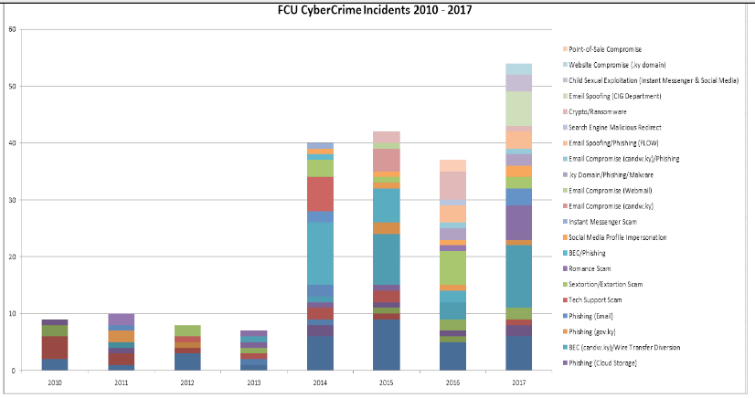 The RCIPS Cyber Unit has been monitoring cyber crime incidents in the Cayman Islands since 2010. While the Unit is limited in its ability to investigate cyber-dependent and cyber-enabled crime at this time, its capacity is increasing, with the goal of incorporating digital forensics, cyber incident response and cyber crime analysis and investigation services to support all law enforcement agencies and CI Government departments in combatting both “traditional” crime and cyber crime.