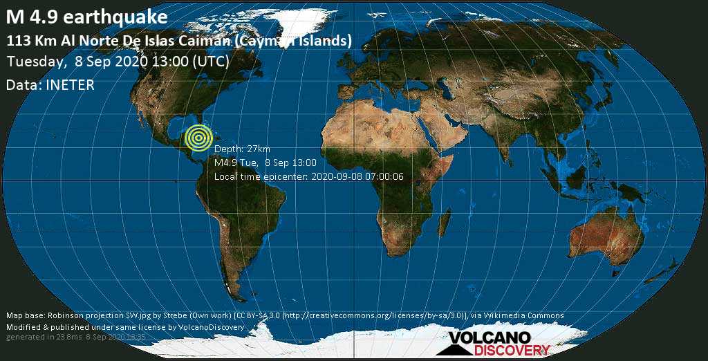 Light mag. 4.9 earthquake – 113 Km al norte de Islas Caimán (Cayman Islands) on Tuesday, 8 September 2020 at 8:00AM local time (13:00 UTC).