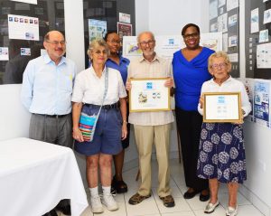 3. L-r: Stamp Advisory Committee member Mr. Ivan Burges, past member Mrs. Ann Stafford, Philatelic Bureau Acting Manager Shindi Beput, renowned naturalist Dr. Richard Askew, Postmaster General, Ms Sheena Glasgow and artist of the moths stamps series, Mrs. Letitia Askew