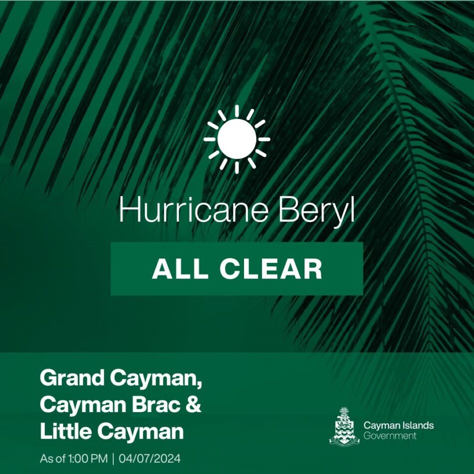 The National Emergency Operations Centre (NEOC) has issued the All Clear for Grand Cayman today Thursday, 4 July 2024 at 1pm. Hurricane Beryl continues traveling west-northwest at a speed of 20 miles per hour.