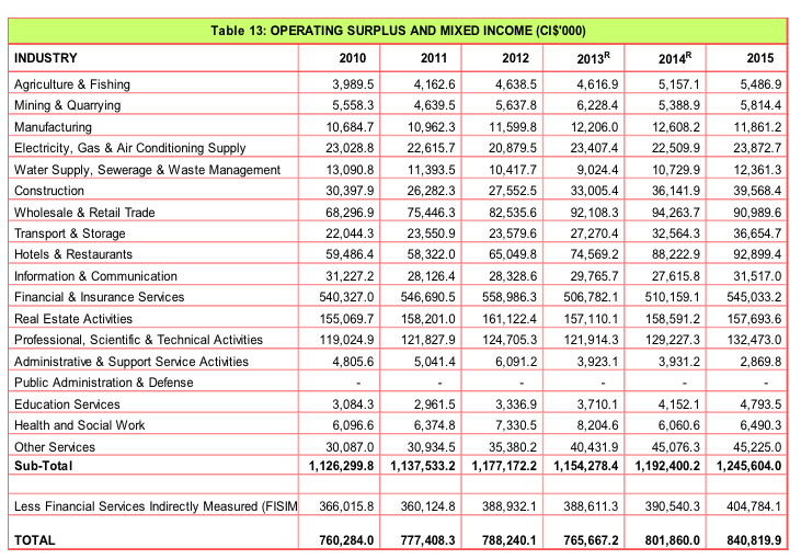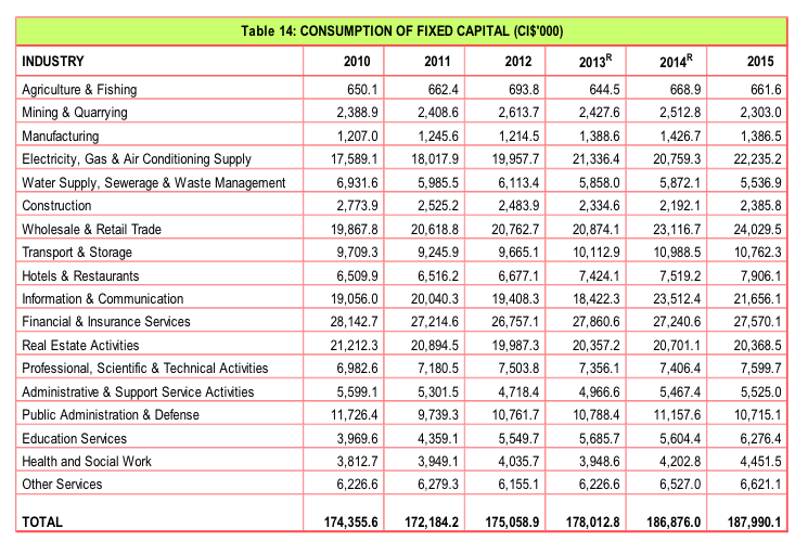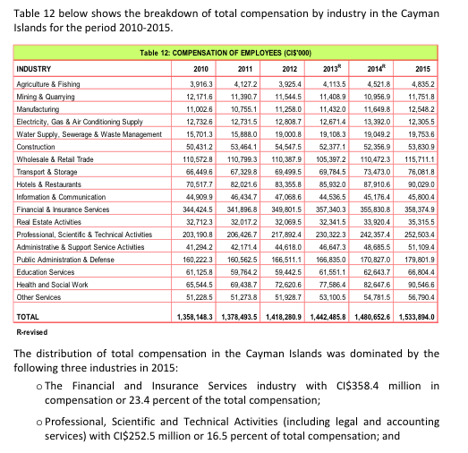 1.12 In 2015, total compensation of employees increased to CI$1,533.9 million or 50.1 percent of GDP; total operating surplus/mixed income reached CI$840.8 million or 27.5 percent of GDP; consumption of fixed capital was estimated at CI$188.0 million or 6.1 percent of GDP while total taxes on production and imports (less subsidies) was valued at CI$498.8 million or 16.3 percent of GDP.