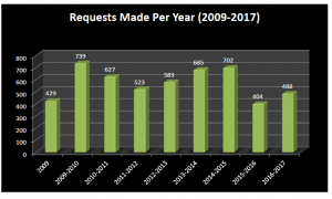 approximately 6% higher than the 2015-16 year. Since 2009 about half of requests were either