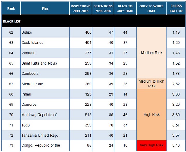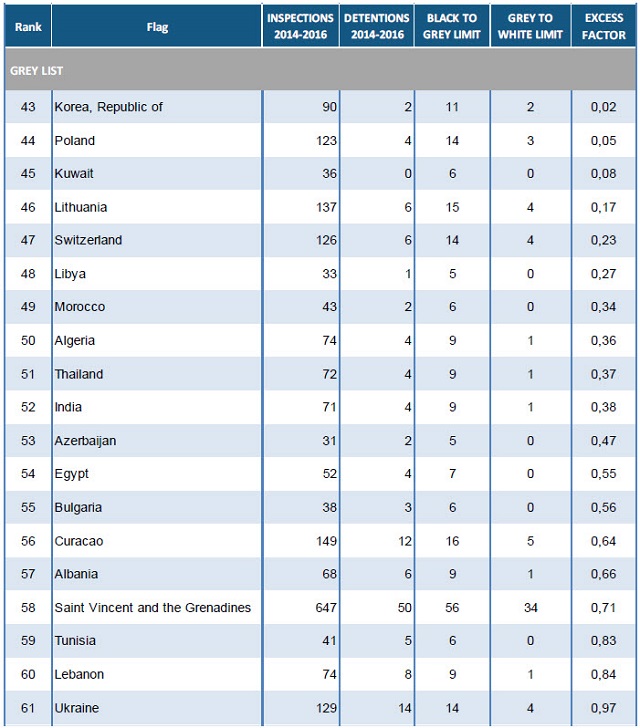 There are 42 flags on the white list, 19 on the grey list and 12 on the black list. The list is based on the number of inspections and detentions over a three-year rolling period for flags with at least 30 inspections in the period. The white list represents quality flags with a consistently low detention record.