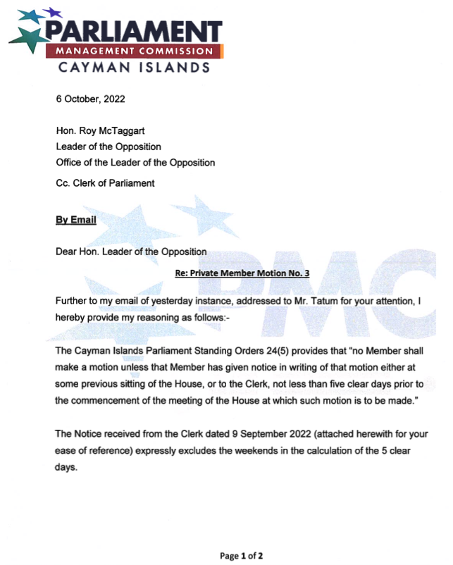 Homepagefront pg storyCayman: Leader of Opposition’s Motion to remove Speaker McKeeva Bush is ‘Out of Time’ Cayman: Leader of Opposition’s Motion to remove Speaker McKeeva Bush is ‘Out of Time’ Posted on October 6, 2022 LEAVE A RESPONSE Cancel replyYour email address will not be published. Required fields are marked *Comment * Name * Email * Website Post navigation Previous PostCayman: Police renew appeal for witnesses in West Bay Road Shooting incident Next PostCayman: New Senior Leadership Team Ministry of IISD excited to champion short and long-term modernising reforms