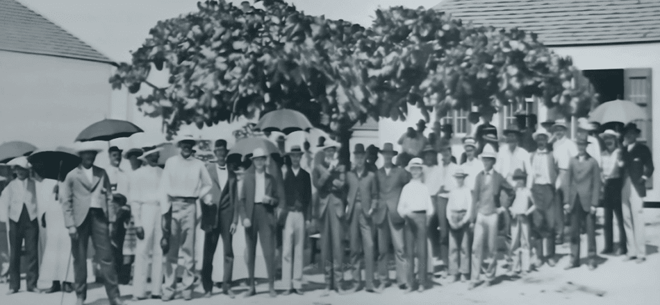 This photograph, published in an 1896 Presbyterian Church journal, bears the caption: “Group under almond tree in front of Court House, George Town, Grand Cayman.” Was this the original courts building back when it was just a single story? Watch the reel