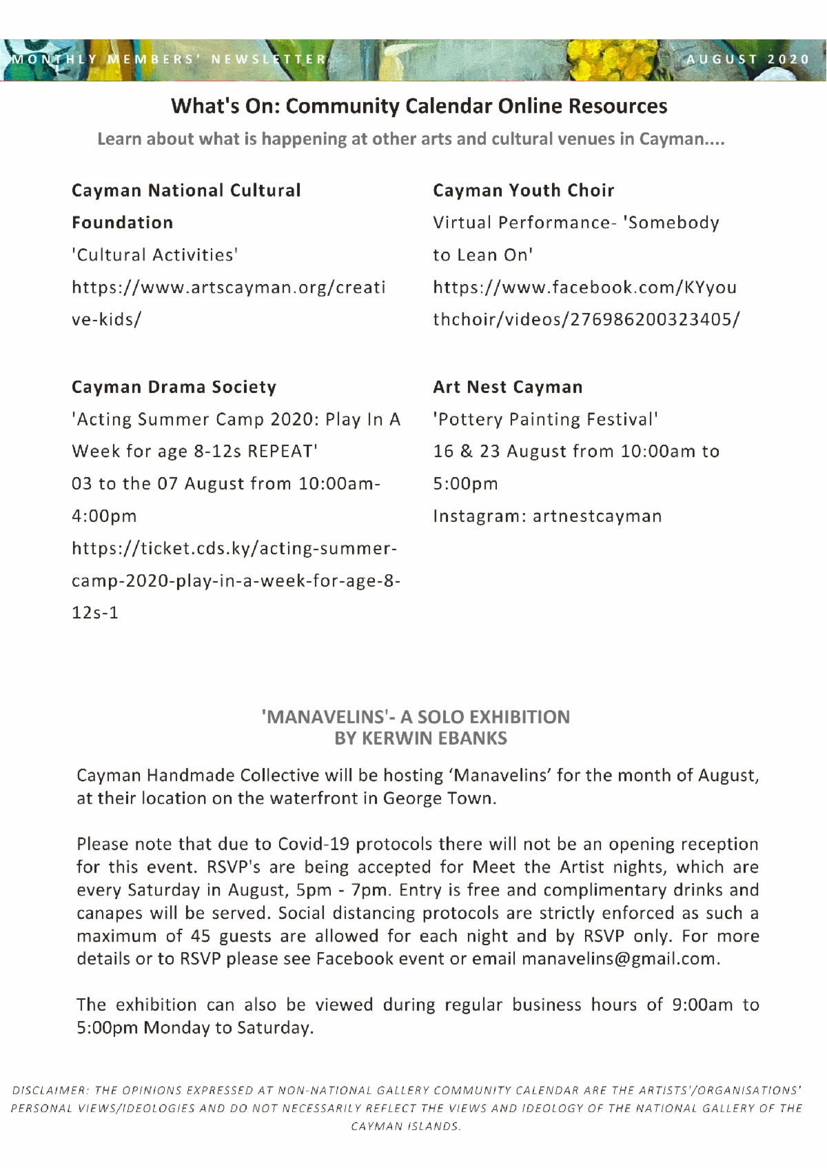 For more go to: National Gallery of the Cayman Islands, P.O. Box 10197, Grand Cayman, KY1-1002 Cayman Islands