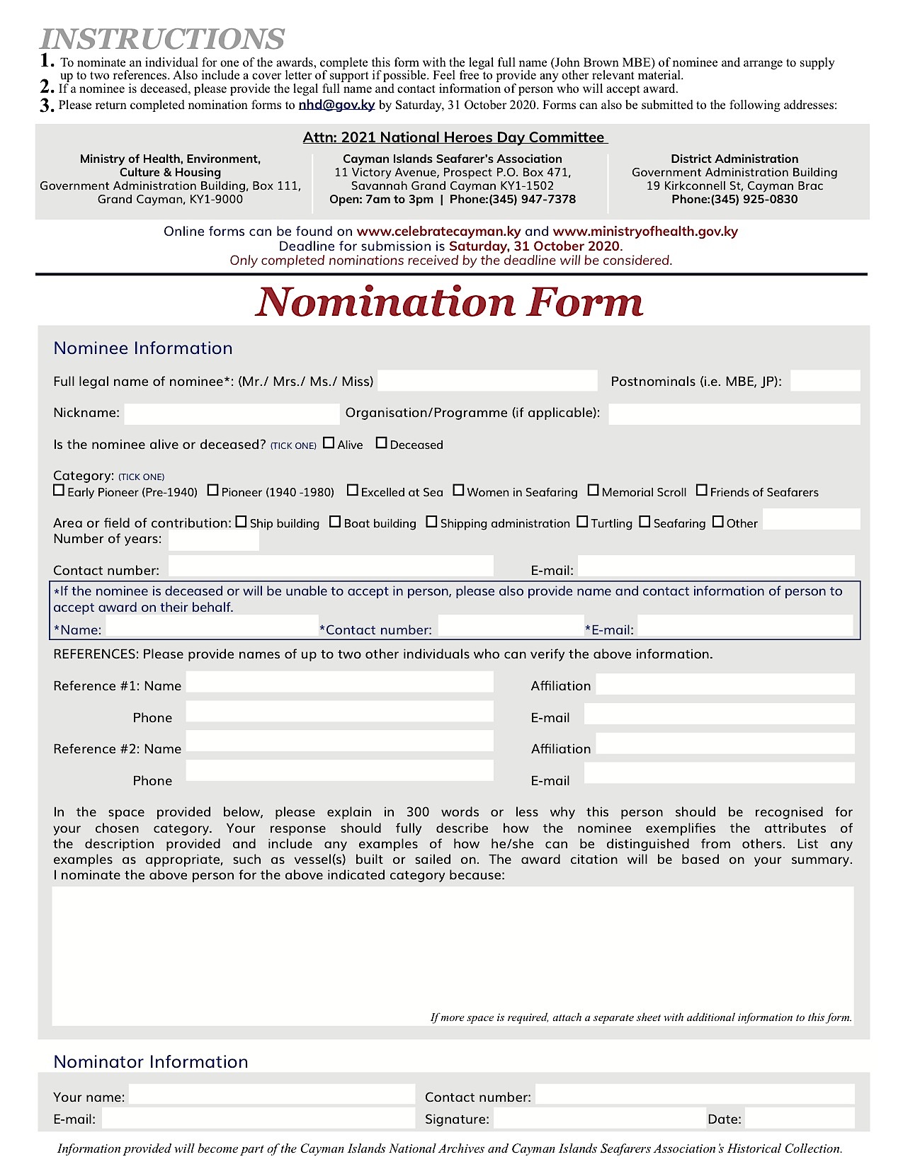 Hard copies of Nomination Forms may also be picked up and dropped off in Grand Cayman at the Government Administration Building, as well as at the Seafarers Association Hall where assistance in filling out nomination will be offered upon request.
