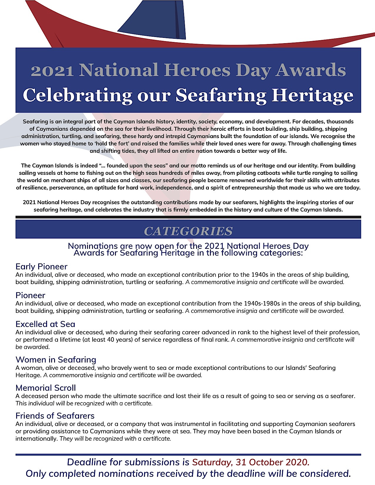 13 October 2020…… National Heroes Day is one of the Cayman Island’s most notable and patriotic annual events. The theme for National Heroes Day 2021 is ‘Celebrating our Seafaring Heritage’ and the Nomination period for awards is now open through 31st October 2020.