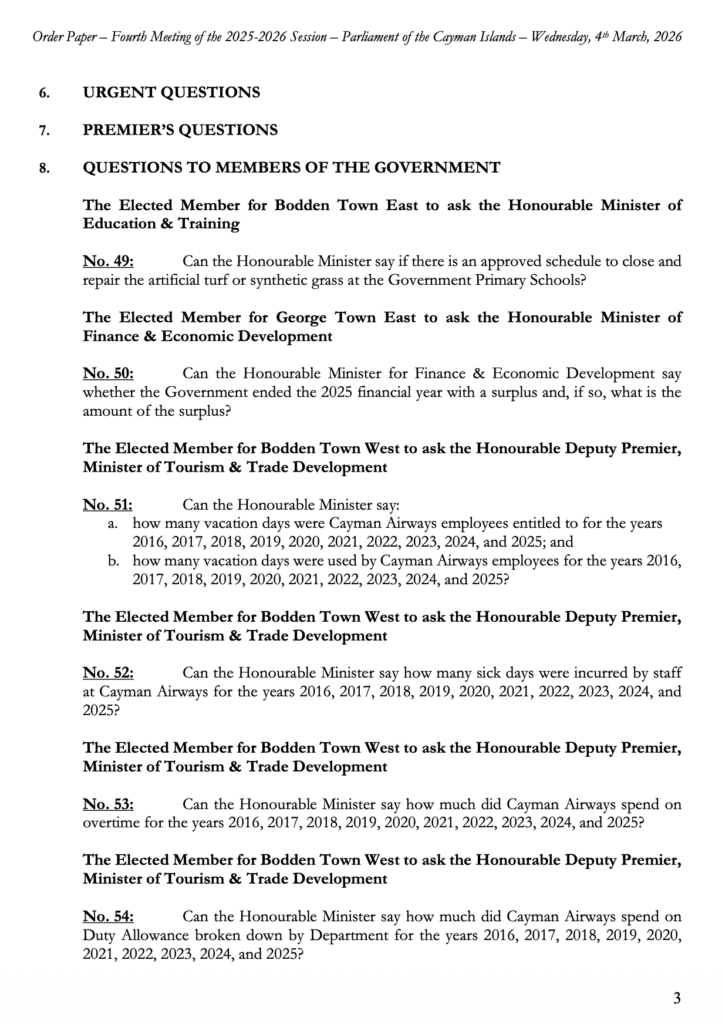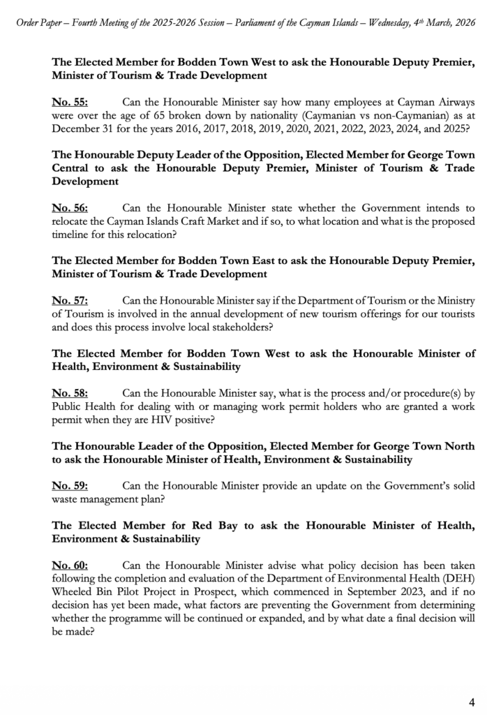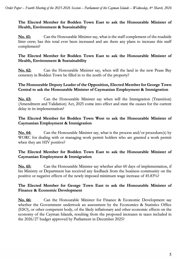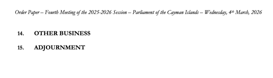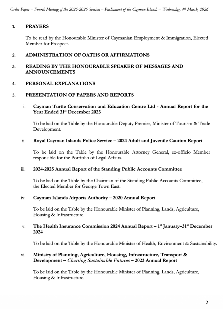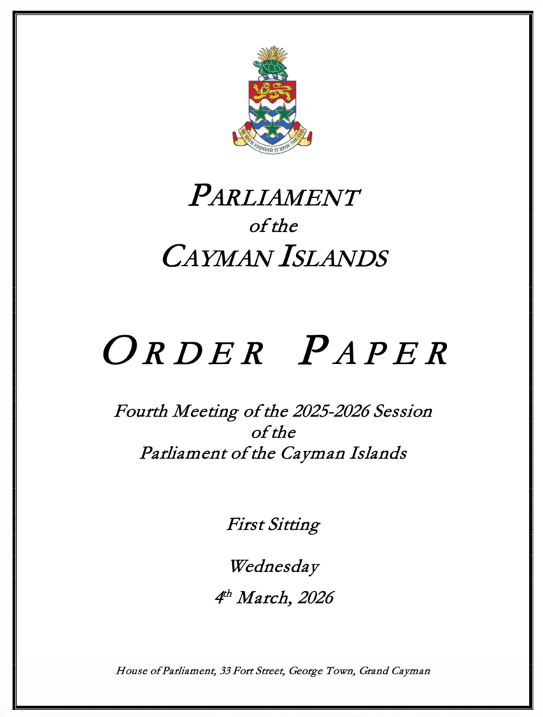 HomepageCaribbean NewsCayman: Order Paper – First Sitting of the Fourth Meeting 2025-2026 Session, Wednesday, 4 March, 2026 at 2:00 pm Cayman: Order Paper – First Sitting of the Fourth Meeting 2025-2026 Session, Wednesday, 4 March, 2026 at 2:00 pm Posted on March 4, 2026 LEAVE A RESPONSE Cancel replyYour email address will not be published. Required fields are marked *Comment * Name * Email * Website Post navigation Previous PostCRISIS Session: ‘Middle East War’ at OffshoreAlert Bangkok Next PostChile becomes the first country in the Americas to be verified by WHO for the elimination of leprosy
