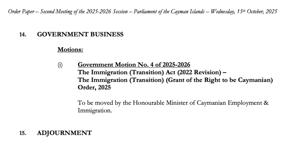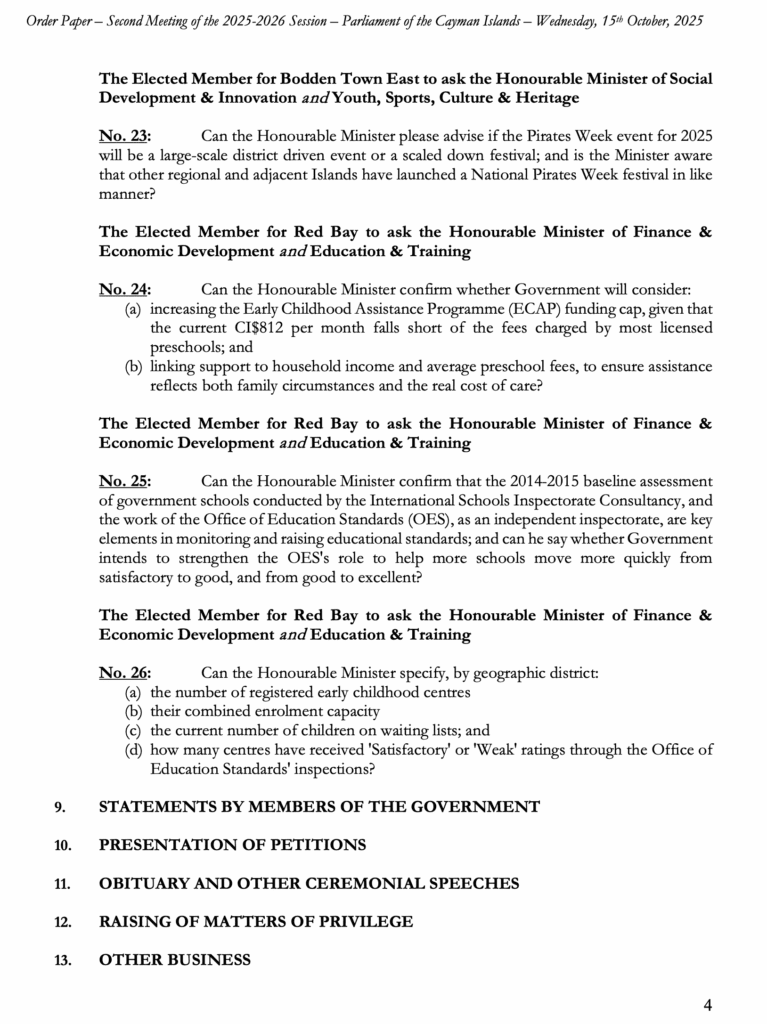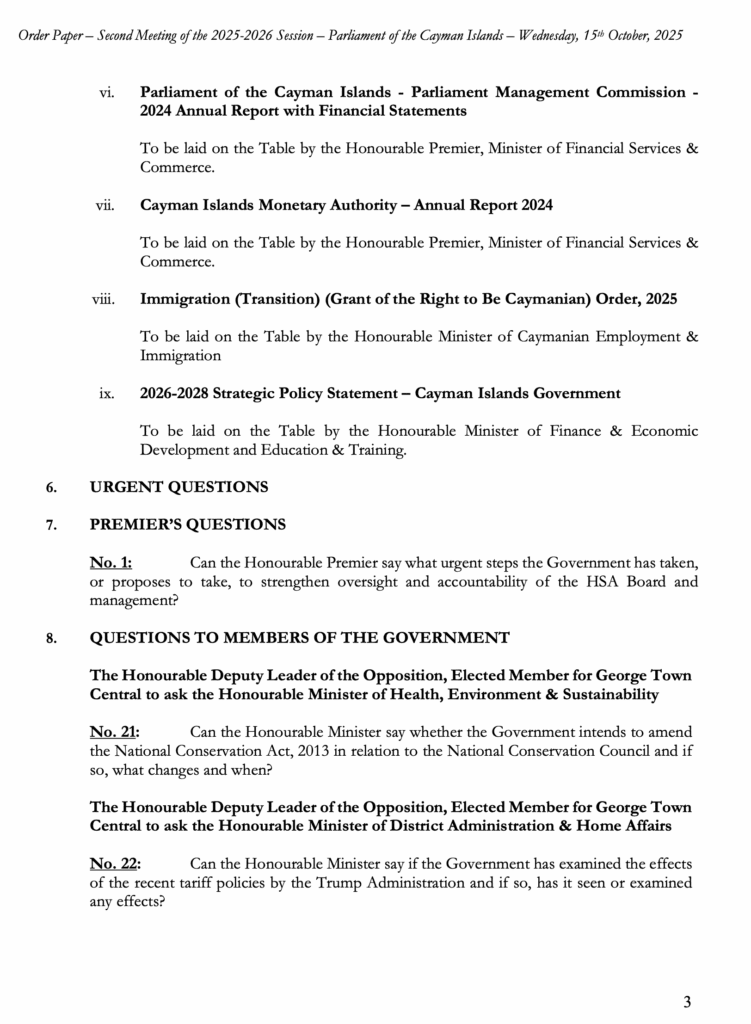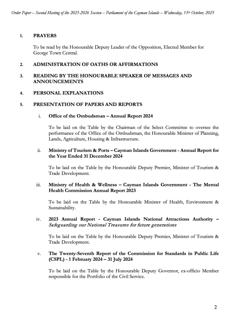 Cayman Order Paper – First Sitting of the Second Meeting 2025-2026 Session