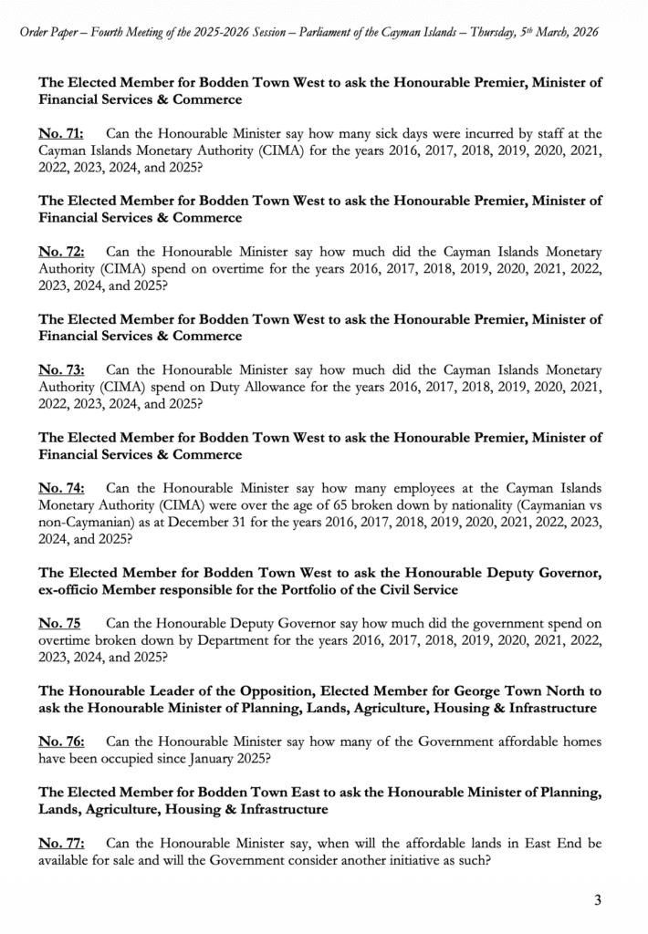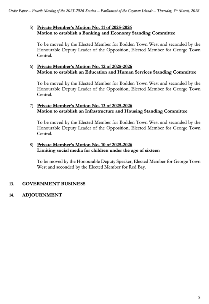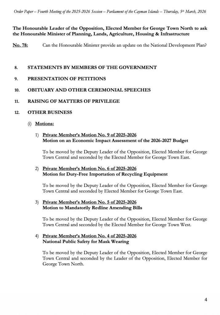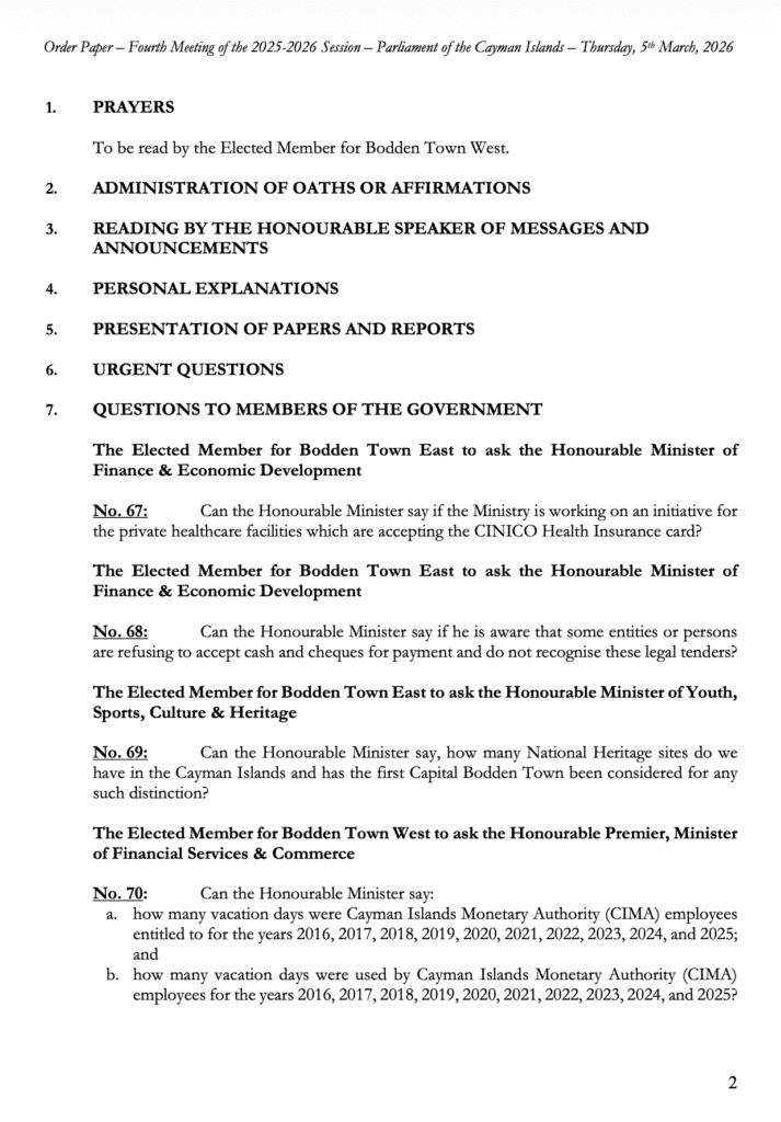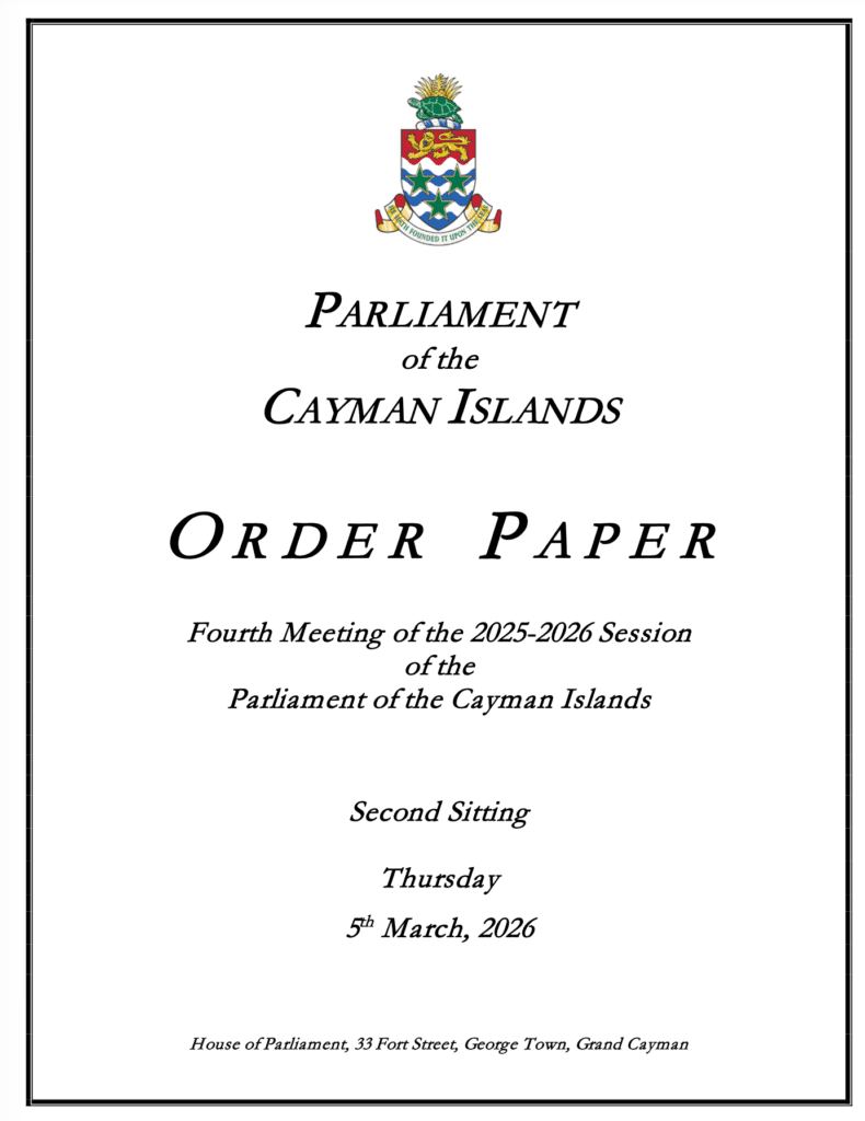 HomepageCaribbean NewsCayman Order Paper – Second Sitting of the Fourth Meeting 2025-2026 Session, Thursday, 5 March 2026 at 10:00am Cayman Order Paper – Second Sitting of the Fourth Meeting 2025-2026 Session, Thursday, 5 March 2026 at 10:00am Posted on March 5, 2026 LEAVE A RESPONSE Cancel replyYour email address will not be published. Required fields are marked *Comment * Name * Email * Website Post navigation Previous PostCayman: Police Arrest Man on Suspicion of Immigration Fraud Next Post3 things you should know about cancer and the heart