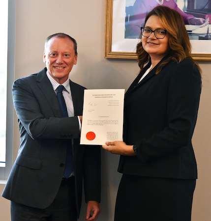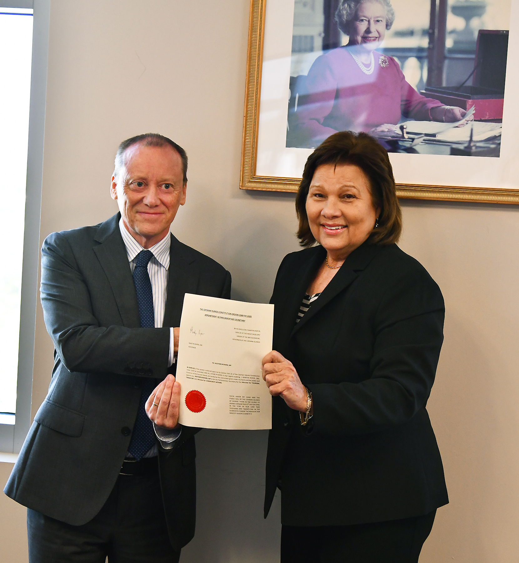Hon. Katherine Ebanks-Wilks, the Deputy Speaker of Parliament, received the document from the Governor to serve as the Parliamentary Secretary to the Minister for Financial Services Hon. Andre Ebanks as well as Minister for Education Hon. Juliana O’Connor-Connolly.