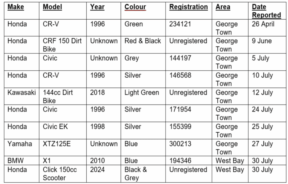 The RCIPS is also asking the public to be on the lookout for the below reported stolen vehicles, which remain outstanding: