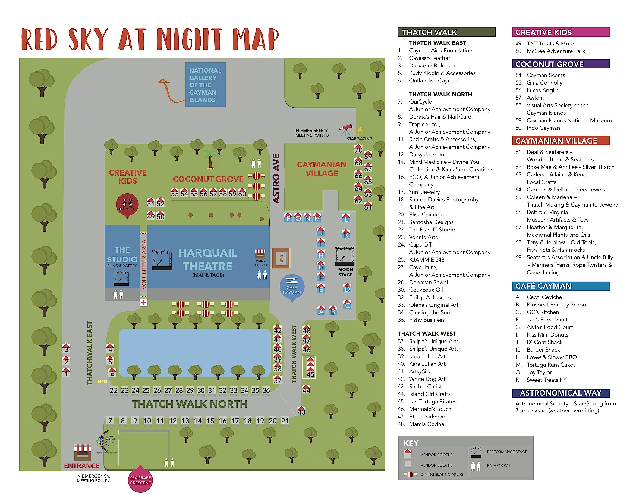 Those attendees looking for unique local gifts and treasures will have lots of opportunities to spend money on the Thatch Walk and Coconut Grove which feature 50+ artisan booths selling everything from paintings, oils, soaps and jewellery to sculptures, clothing, woodwork, calligraphy prints, ceramics and photos. The Creative Kids area will provide supervised activities and specialty food for kids ages three to 12 and there will also be stargazing along Astronomical Way if the skies are clear.