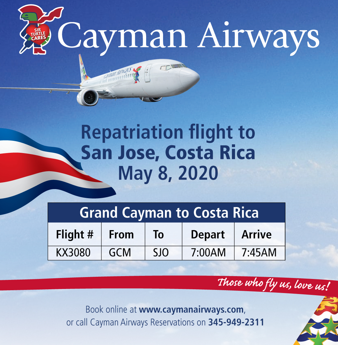 Cayman Airways Limited (CAL) has confirmed a repatriation flight from Grand Cayman to San Jose, Costa Rica, for Friday May 8, 2020, in partnership with the Cayman Islands Government.