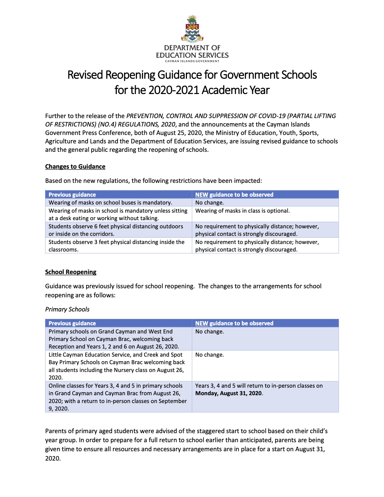 HomepageCaribbean NewsCayman: Revised reopening guidance for Government Schools for the 2020-2021 academic year Cayman: Revised reopening guidance for Government Schools for the 2020-2021 academic year Posted on August 26, 2020 LEAVE A RESPONSE Cancel replyYour email address will not be published. Required fields are marked *Comment * Name * Email * Website Post navigation Previous PostSEAT adds a raft of new features and enhancements to its vehicle line-up Next PostCayman: Pedro St. James presents Movies on the Lawn -UPDATED September schedule