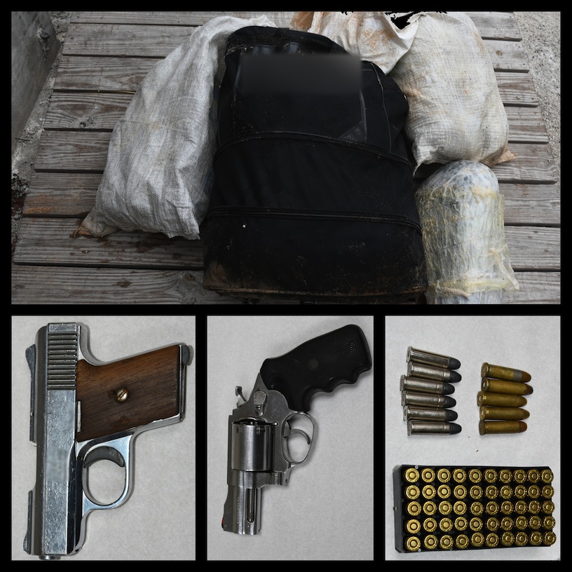 The packages contained suspected ganja and two handguns, along with live rounds of ammunition.