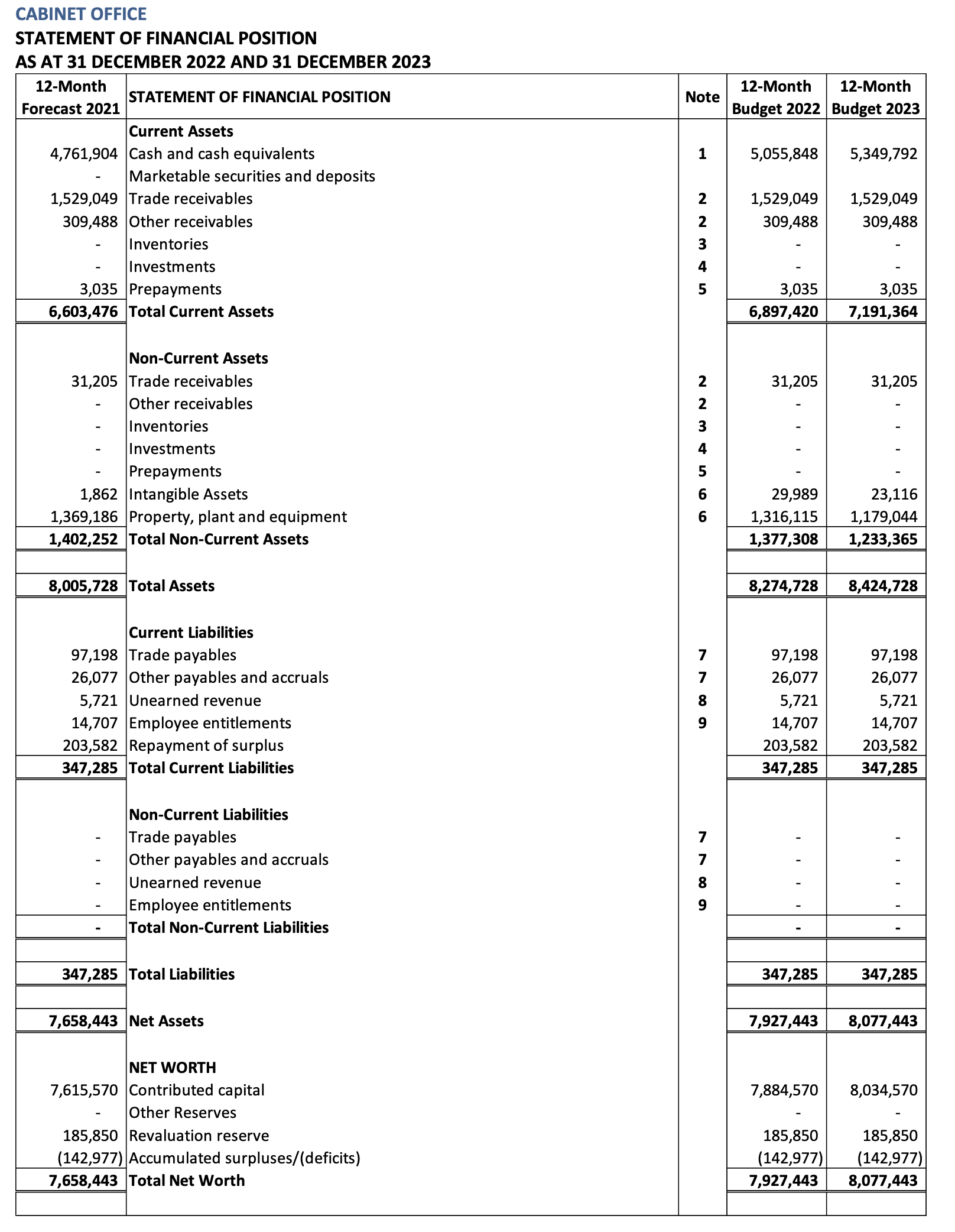 HomepageCaribbean NewsCayman: STATEMENT OF FINANCIAL POSITION AS AT 31 DECEMBER 2022 AND 31 DECEMBER 2023 Cayman: STATEMENT OF FINANCIAL POSITION AS AT 31 DECEMBER 2022 AND 31 DECEMBER 2023 Posted on November 27, 2021 LEAVE A RESPONSE Cancel replyYour email address will not be published. Required fields are marked *Comment * Name * Email * Website Post navigation Previous PostCayman: 2022/2023 Budget Performance Targets Next PostCayman: Financial Services Minister engages with EU and UK Representatives