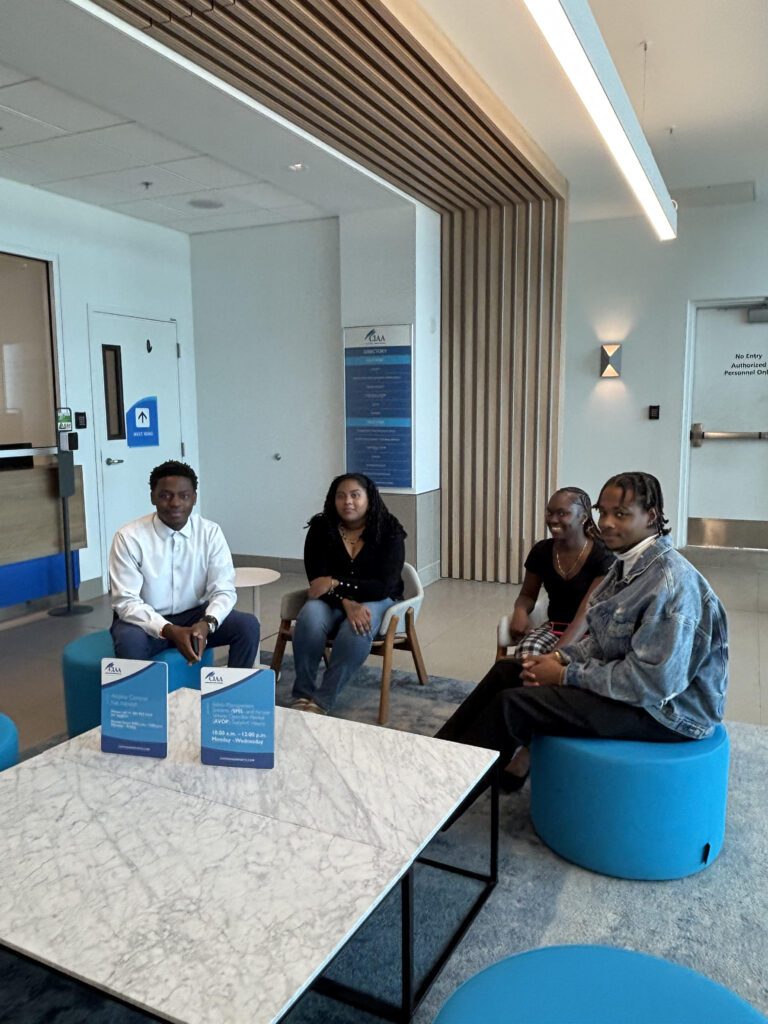 PHOTO: Interns seated in the CIAA Reception. (L to R): Business Development and Marketing & Communications Intern Nathan George, Aeronautical Information Services (AIS) Intern Ciara Suberan-Myles, Customer Service & Ground Transportation InternChambria Johnson, Airport Operations Intern Damar Connor. Missing from photo: HR Temp – Intern & Special HR Projects InternNicky Manderson and CKIA Aeronautical Information Services (AIS), Operations and Air Traffic Control (ATC) Intern Sean Lucas-Martinez.