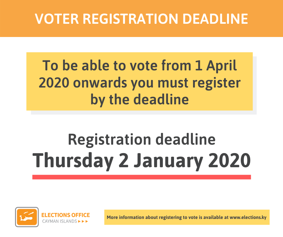The Elections Office reminds the public that the deadline to register to vote is Thursday, 2 January 2020. Those who register by this date will be included in the register of electors and be able to vote from 1 April 2020 onwards.