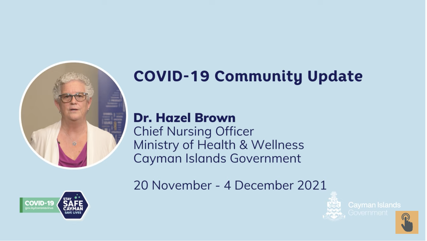 Grand Cayman, 10 December 2021 – Chief Nursing Officer Dr. Hazel Brown today issued a weekly video update from the Public Health Department on trends observed in COVID-19 data over the prior week.