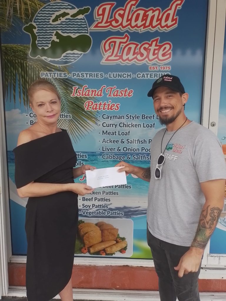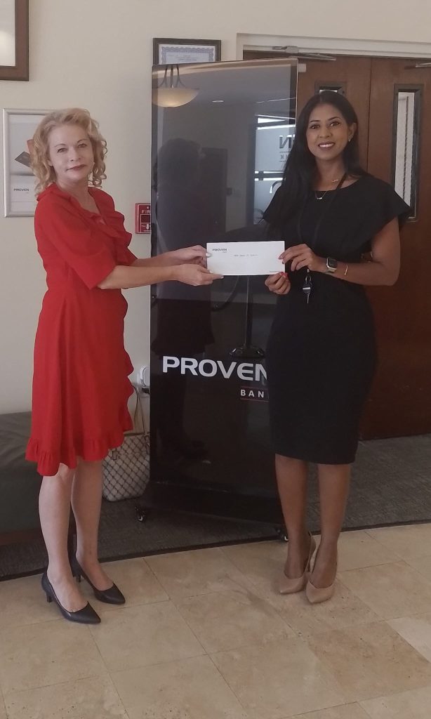 Tracey Pilkey accepts donation from Nikita Kissoon, Chief Financial Officer of Proven Bank in Cayman.