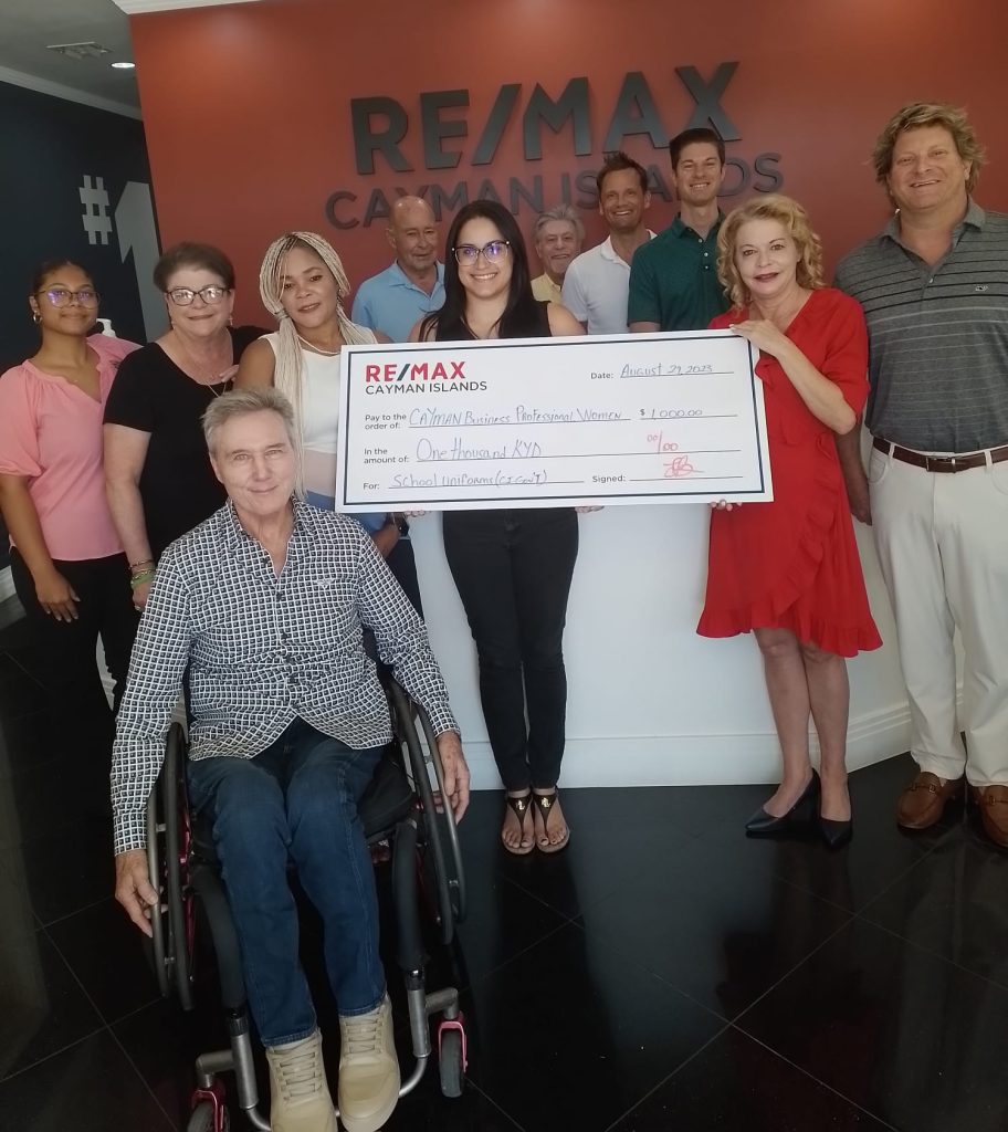 Kim Lund of the Cayman Lund Team, RE/MAX gather together to show their support as a donation is provided to BPW’s Back2School initiative.