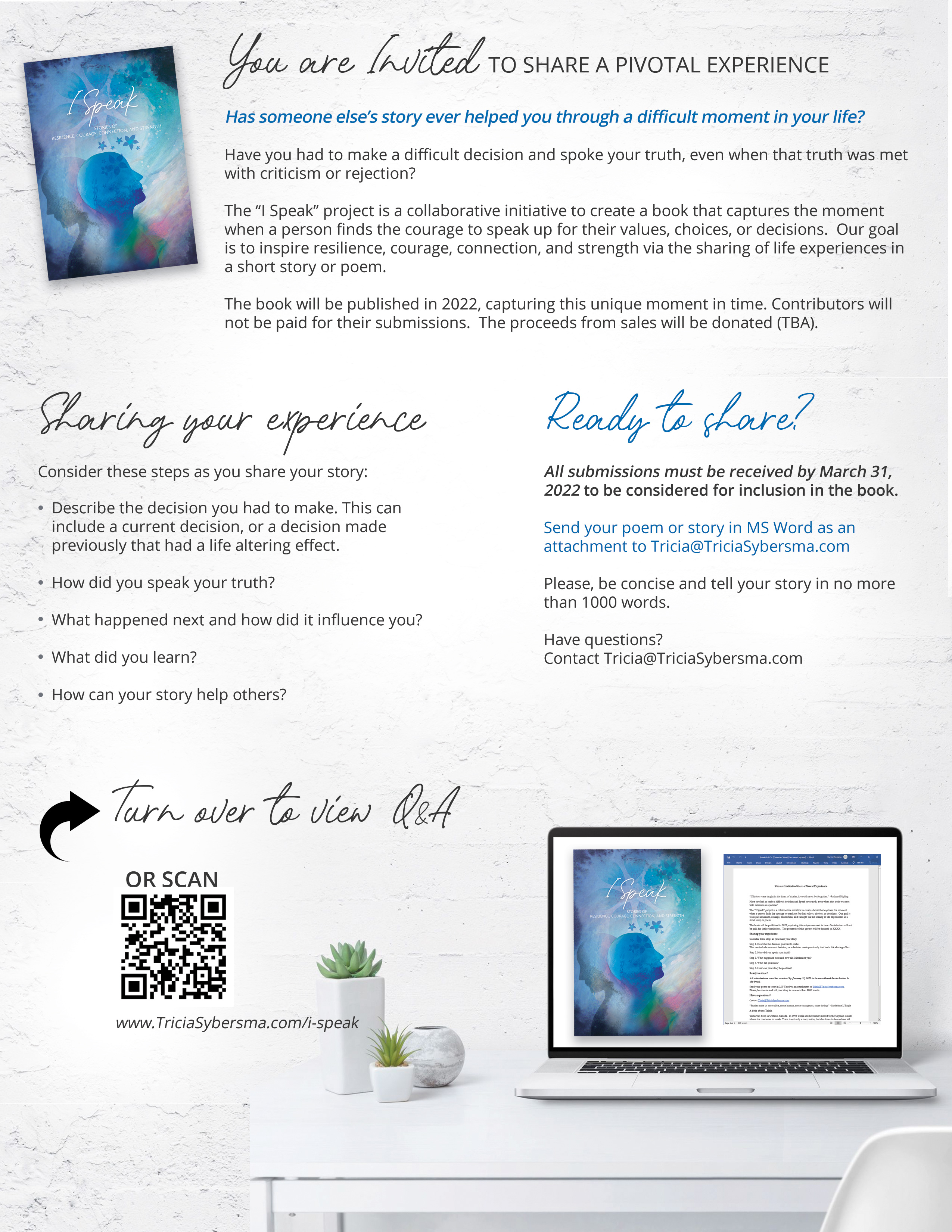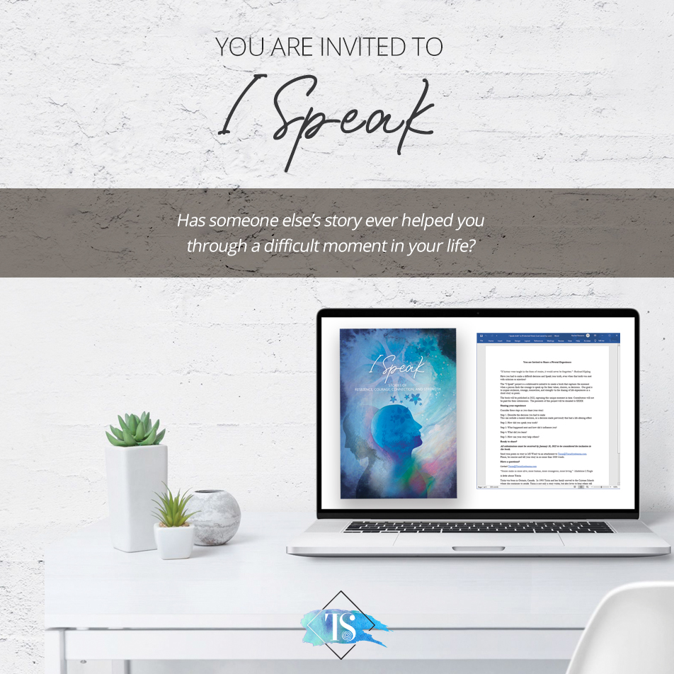 Have you had to make a difficult decision and spoke your truth, even when that truth was met with criticism or rejection?The “I Speak” project is a collaborative initiative to create a book that captures the moment when a person finds the courage to speak up for their values, choices, or decisions. Our goal is to inspire resilience, courage, connection, and strength via the sharing of life experiences in a short story or poem.The book will be published in 2022, capturing this unique moment in time. Contributors will not be paid for their submissions. The proceeds from sales will be donated (TBA).