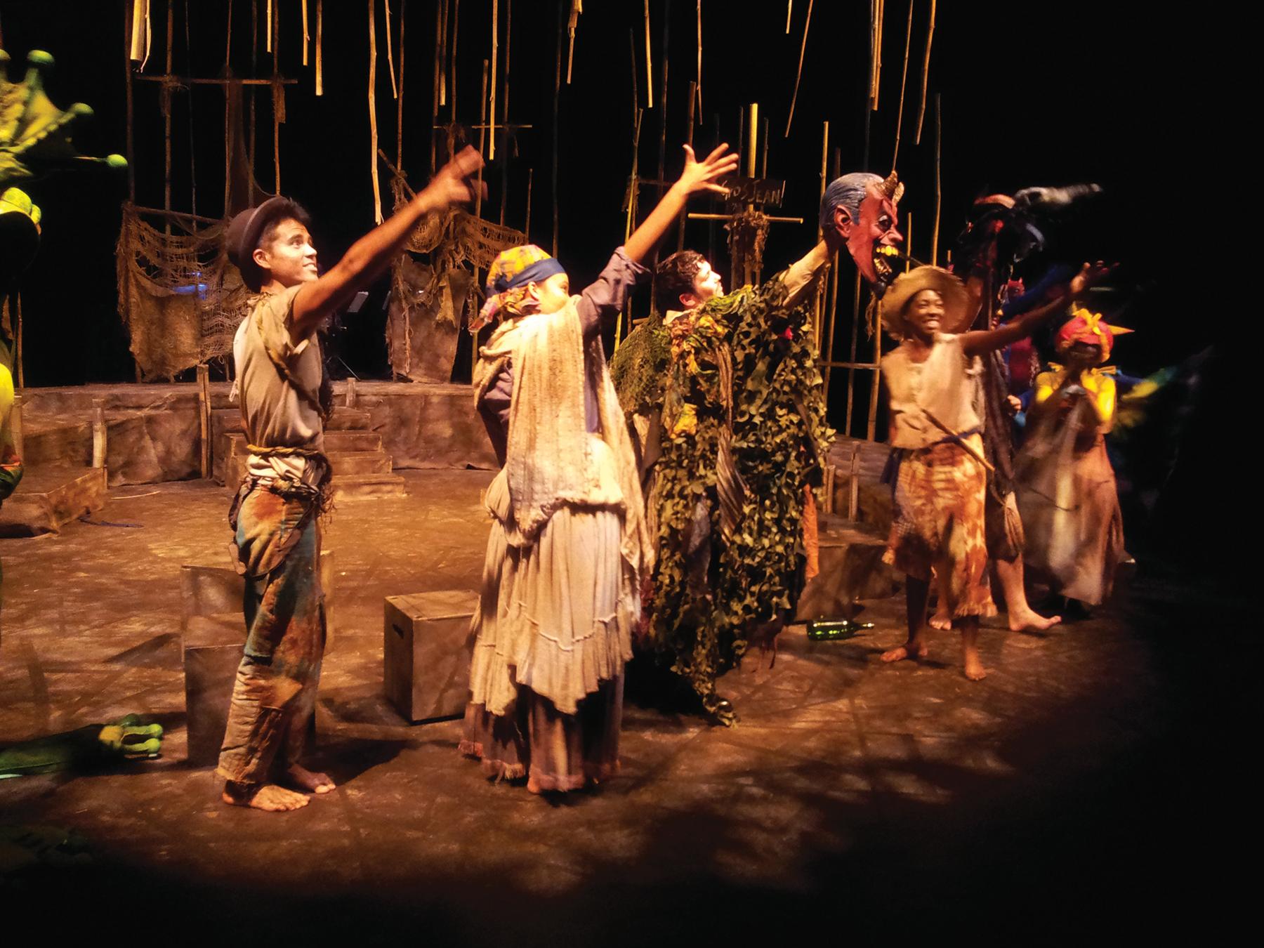 The audience is transported instantly to the Caribbean, due to the elaborate hut-like stage, island music performed by a live band and the intense visuals of the extravagant costumes designed by new faculty member Yao Chen, that allow actors dressed as goats, birds, bugs, frogs and demonic creatures to leap across the stage in equally ornate costuming.