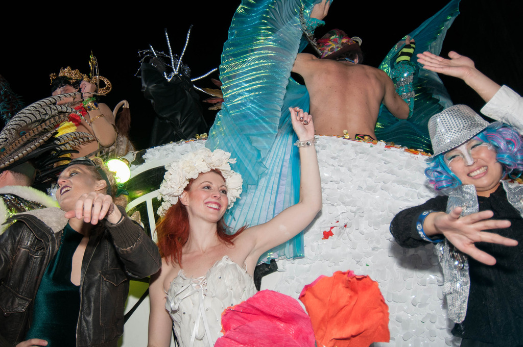 The atmosphere was festive like a New Year’s Eve night; grown up men and women dressed up in all types of fantasy costumes ready to exhibit for the crowd at the parade, which was immense. I was wondering how I could see to report accurately. My good angel whispered in my ear, show the cops your press credentials and, voila, I was in, like an official enjoying the best view of the parade.