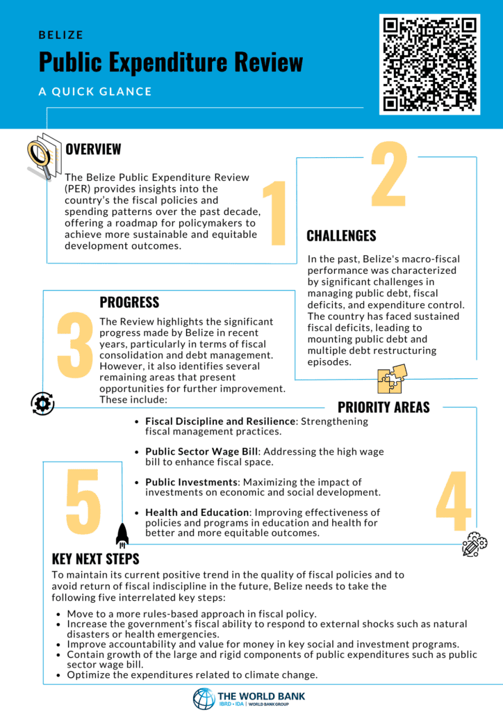 “The compounding challenges of high debt, global financial conditions, and low growth rates intensify the strain on public budgets. This review takes a close look at the core of Belize’s fiscal challenges and identifies steps toward establishing a sustainable fiscal framework for public expenditure in Belize and maximizing value for money in important sectors such as health and education,” said Lilia Burunciuc, World Bank Country Director for the Caribbean.
