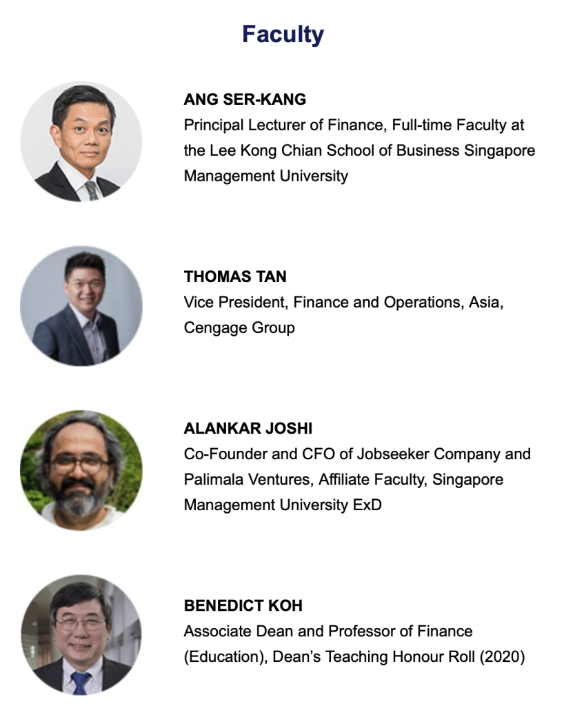| The programme comprises 20 modules that cover all aspects of leadership to transform your team and organisation. A. Core Courses Pillar 1: Organisational Financial Strategies Module 1: CFO as a Strategic Partner Module 2: Aligning Corporate and Financial Strategy Module 3: Measuring Strategy Module 4: Strategic Thinking: Driving Innovation Through Design Thinking Module 5: Strategic Value Drivers Module 6: Value Creation in Companies Pillar 2: Financial Management and Corporate Governance Module 7: Financial Planning and Analytics Module 8: Organisation Valuation Module 9: Corporate Governance, ESG Investing and Reporting Module 10: Portfolio Management, Capital Allocation and Expenditure Module 11: Financial Misconduct Module 12: Mergers and Acquisitions Module 13: Raising Capital and Managing Investors Module 14: Long-term Financial Planning Module 15: Banking Relationships Pillar 3: Technologies In Finance Module 16: Artificial Intelligence Module 17: Blockchain Technologies Module 18: Digital Transformation Module 19: Big Data in Finance Pillar 4: Leadership In Finance Module 20: Building Powerful Relationships Module 21: Future of Work in Finance Module 22: Qualities of a Financial Leader B. Campus experience and networking events* Participants will be invited to attend a 2-day Campus experience and networking events at the end of the 9-month journey at SMU campus. During this event, participants will have the opportunity to network with fellow global financial leaders and interact with programme faculty/director. |