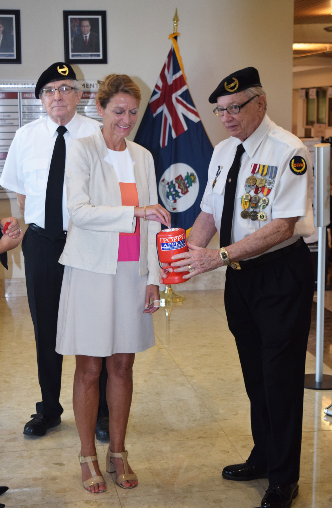 2. Mike Marshall (left) looks on while Her Excellency the Governor Helen Kilpatrick puts a donation into the collection box held by Capt. Dale Banks, CMH. president of the Cayman Islands Veterans Association.