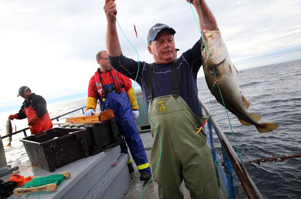 Fisherman Reg Best hoists a cod from the water while working with the research team. (Craig F. Walker/Globe Staff)
