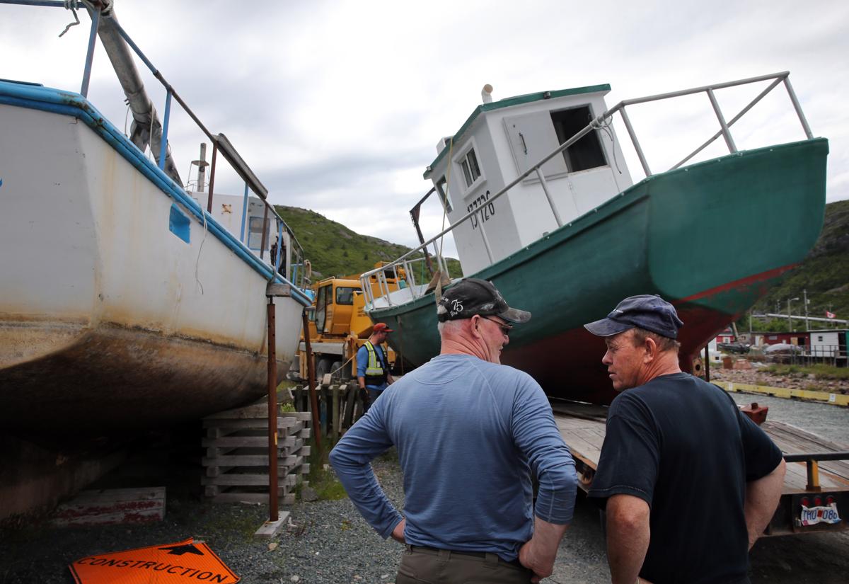 Bernard Chafe (left) and Billy Stratton talk about the trap skiff fishing boat Stratton was buying from Chafe at Petty Harbour. Stratton said he planned to use the bad for cod trapping. (Craig F. Walker/Globe Staff)