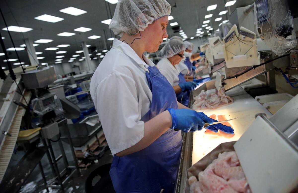 Women work on the flow line, trimming and removing bones from cod fillet, at the Icewater Seafood processing facility in Arnold’s Cove, Newfoundland.. (Craig F. Walker/Globe Staff)