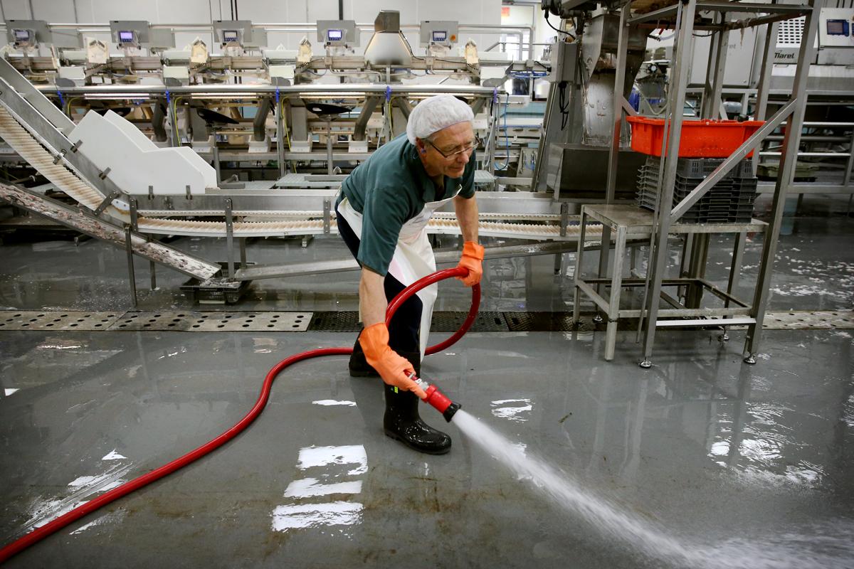 Freeman Veir cleans the floor during a lunchtime break at the Icewater Seafood processing facility. (Craig F. Walker/Globe Staff)