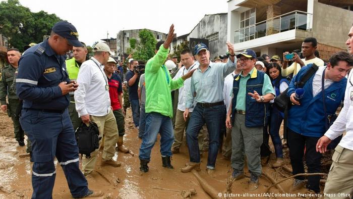 Colombia’s President Juan Manuel Santos visited the scene to get an idea of the situation. “We’ll put together an action plan,” he said, looking shocked. Santos announced he would do everything possible to ensure that the dead were buried with dignity. German Chancellor Angela Merkel has also expressed her sympathy with the victims of the disaster: On Sunday, the deputy government spokesman, Georg Streiter, said in Berlin that Merkel was deeply saddened by the immeasurable suffering of the people of Mocoa.