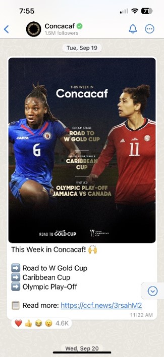 - Concacaf WhatsApp Channel surpasses 1.6m followers in its first month.