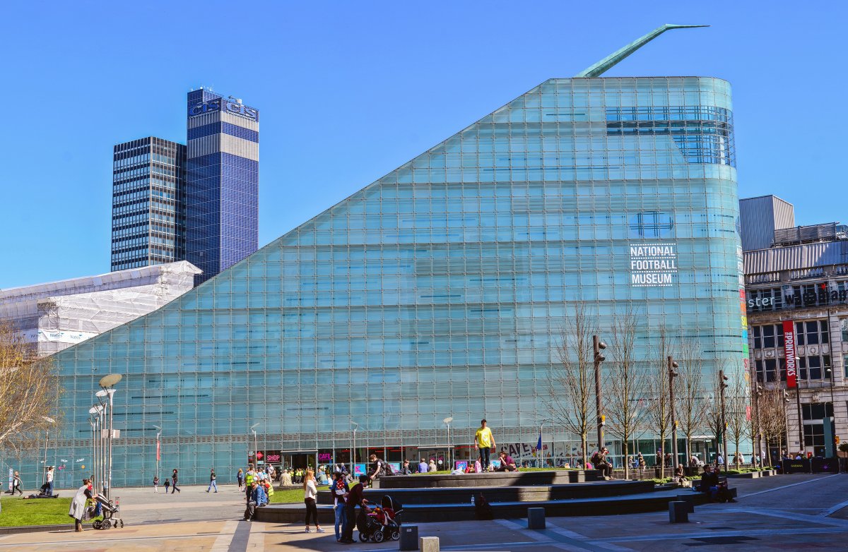 100. The slide-like Urbis building in Manchester, UK, contains a National Football Museum.