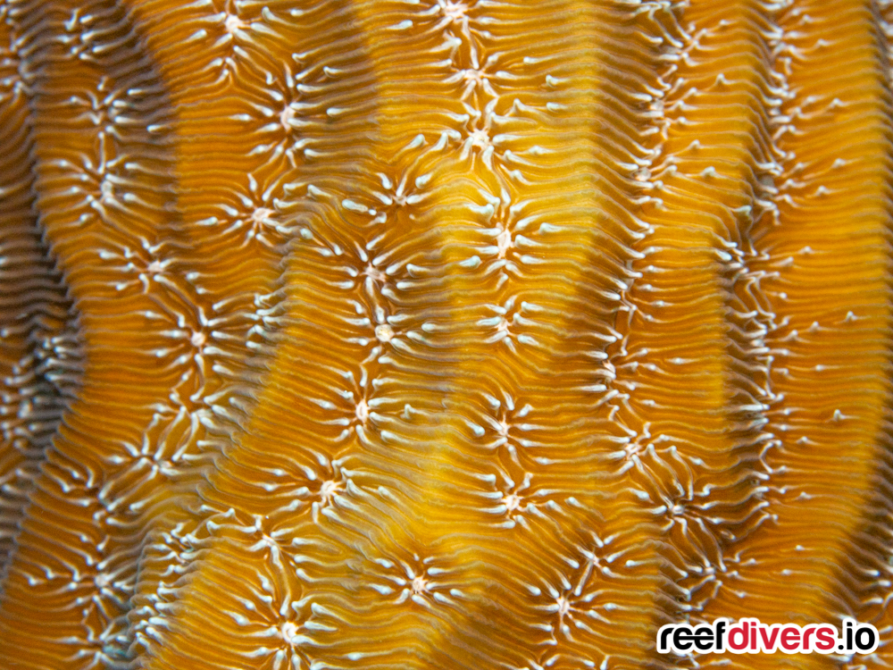 Depending on the species coral polyps and coral tissue can be quite intricate with tiny star-shaped ridges, sticky little tentacles, mouths which look full of teeth or bright color patterns that blend together in as little as a few millimeters.
