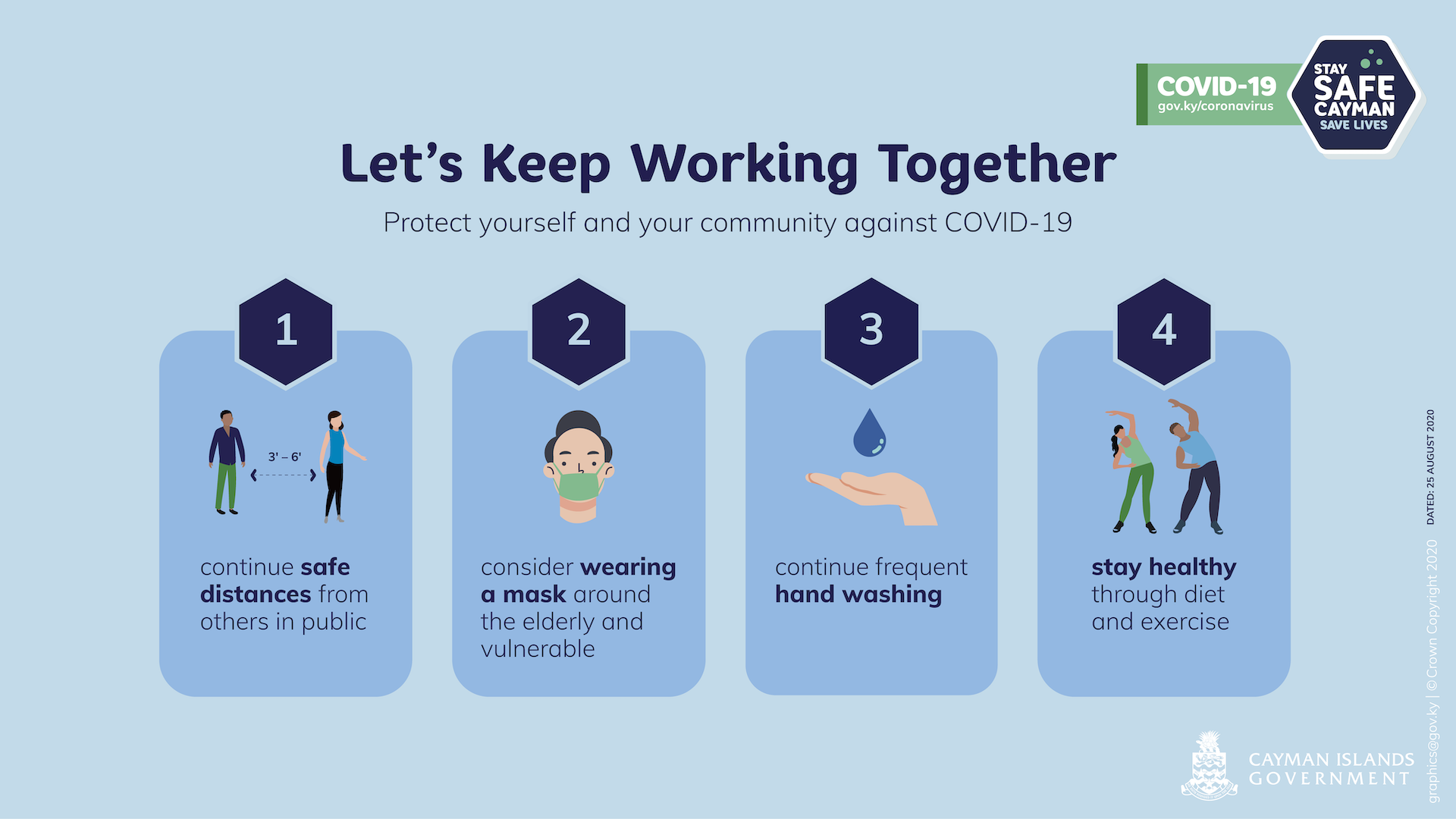 These recommendations are meant to supplement and not replace requirements under the Prevention, Control and Suppression of COVID-19 (Partial Lifting of Restrictions) (No.4) Regulations, 2020. You can always find the latest information and safety guidance at: www.gov.ky/coronavirus.
