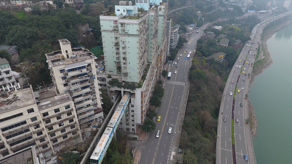 All the same, the building’s design seems to work remarkably well in mountainous and dense Chongqing, where builders say it was necessary to have the train go through the block.