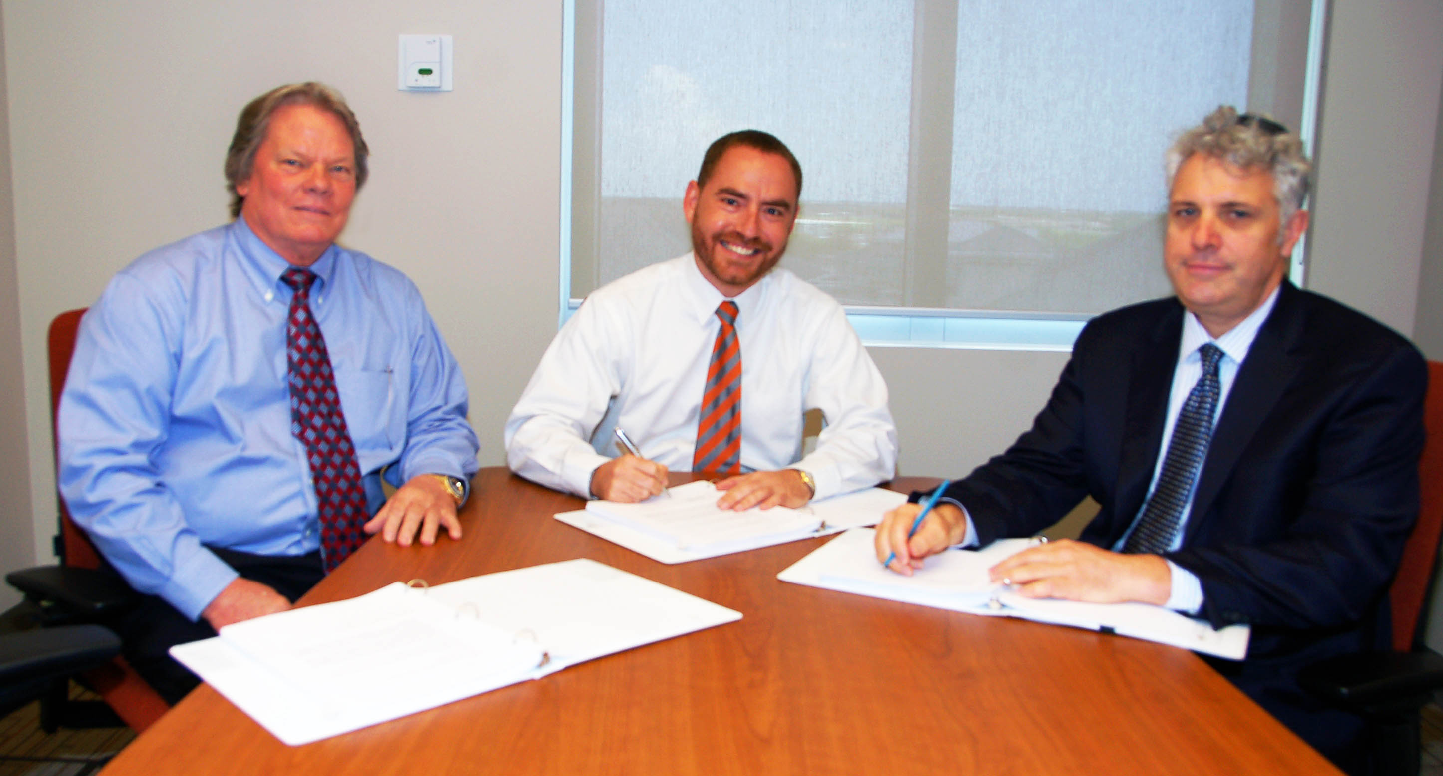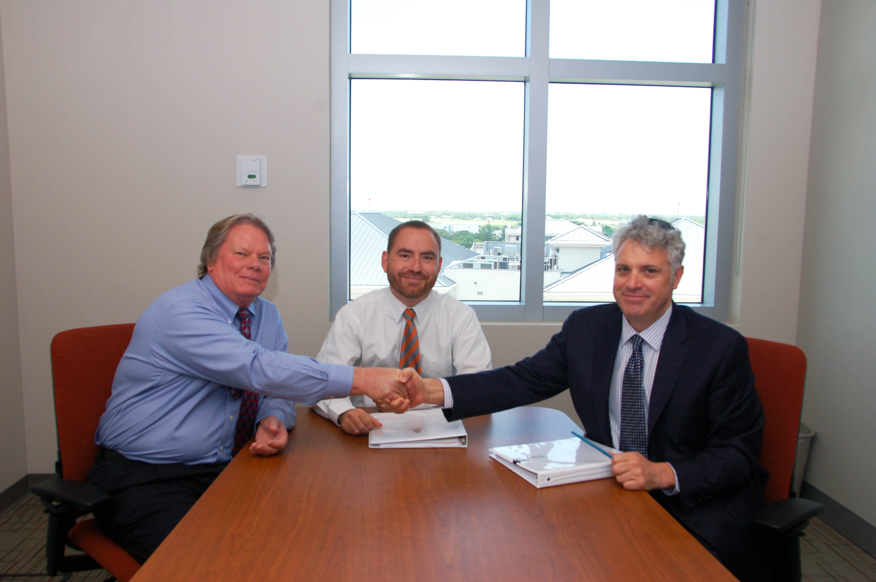 Handshake: Deputy Premier and Tourism Minister Hon. Moses Kirkconnell (left) and Appleby Partner Norman Klein cement, with a handshake, Appleby’s provision of legal oversight for Government’s cruise berthing project. Chief Officer Stran Bodden (centre) signed the contract on behalf of CIG.