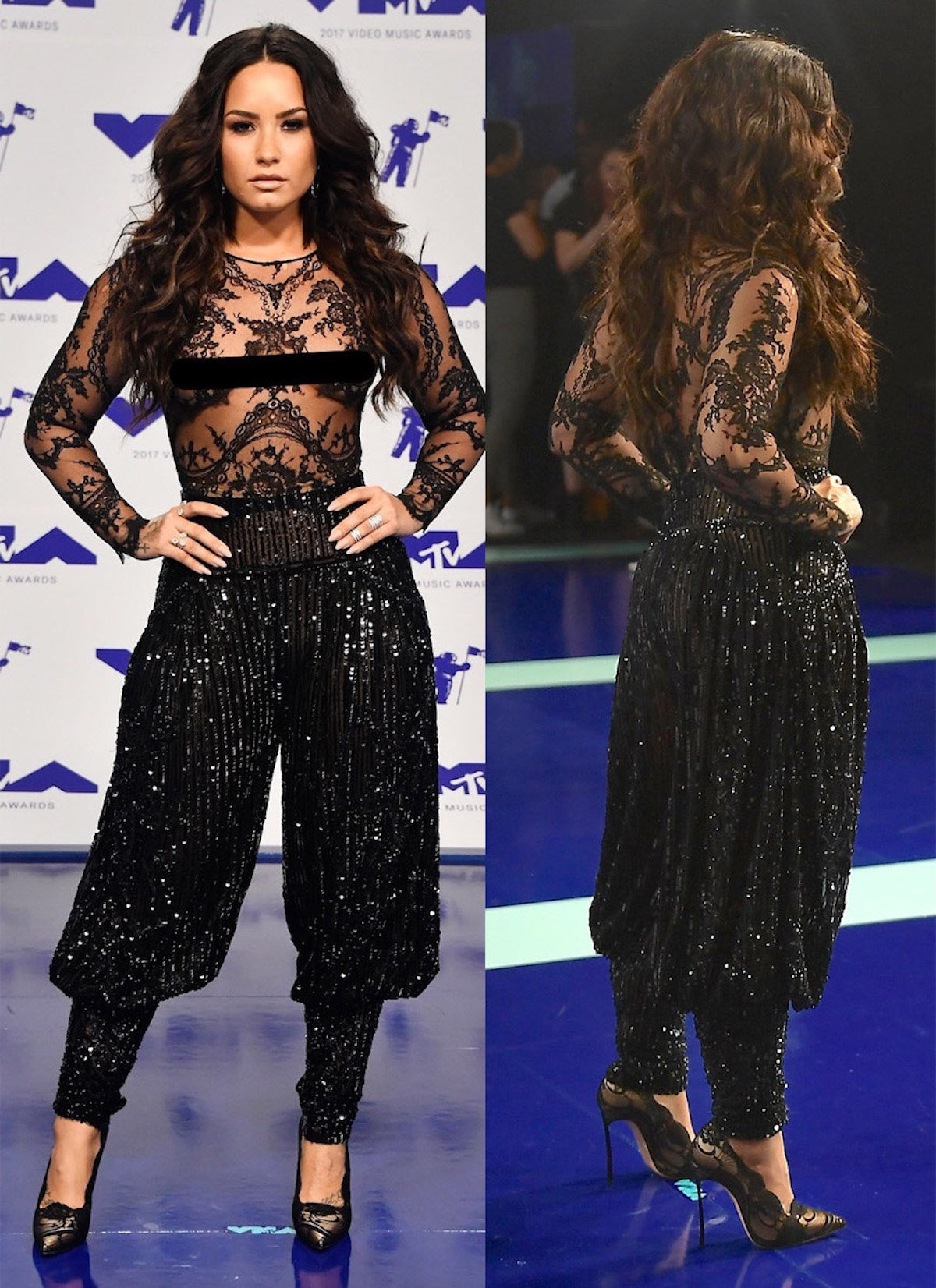 At the MTV Video Music Awards in August 2017, Demi Lovato wore a completely sheer bodysuit tucked into harem-style pants.