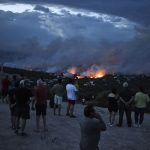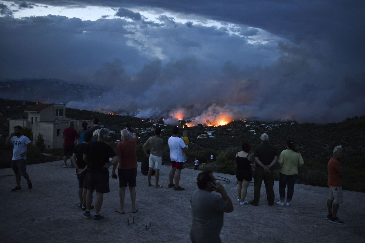 People watch a wildfire in the town of Rafina, near Athens, on July 23.