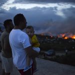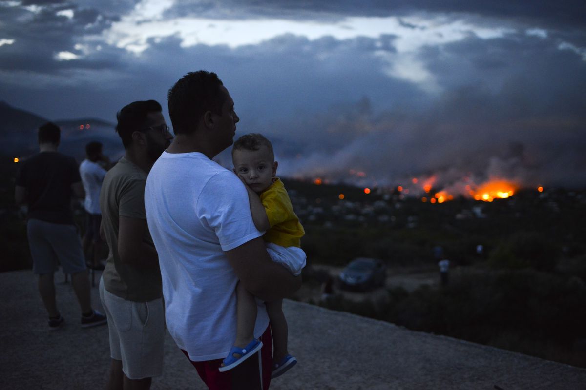 A man holds his son as a wildfire burns in the town of Rafina, near Athens, on July 23.