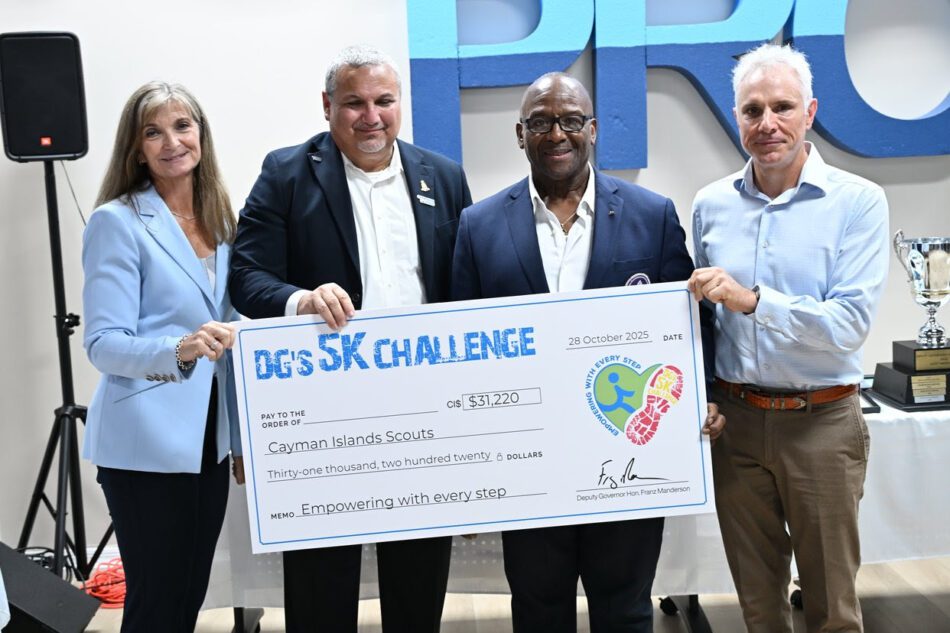 The Deputy Governor’s 5K Challenge 2025 raised CI$93,660, with each of this year’s three beneficiaries receiving CI$31,220. The funds were presented to Cayman Islands Girls’ Brigade, Cayman Islands Scouts Association, and One2One at a reception held at the Intergenerational Hub on Tuesday, 28 October 2025.