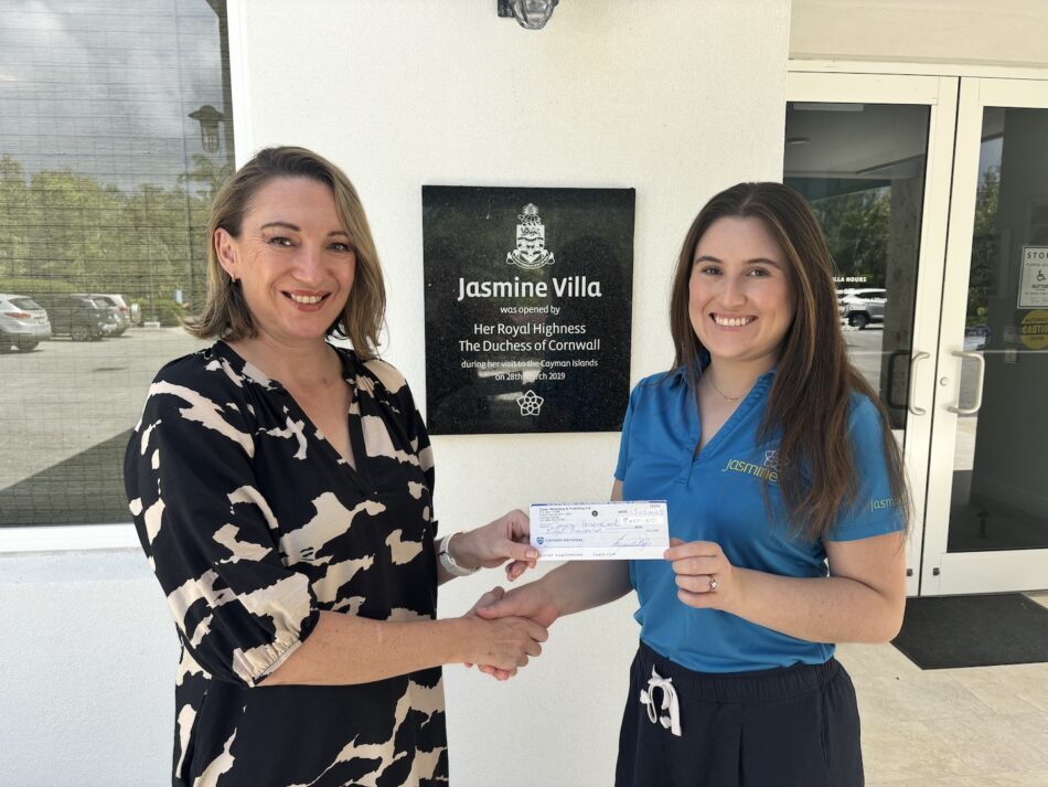 Laura Larner (left), wife of the late Derek Larner, presenting a cheque of $8000 to Stef Prieto (right), Fundraising and Events Assistant at Jasmine.