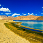 Travel to Pangong Tso Lake, a narrow saline lake in the Himalayas between India and Tibet. The bright blue water, contrasted by the mountains, is absolutely breathtaking.